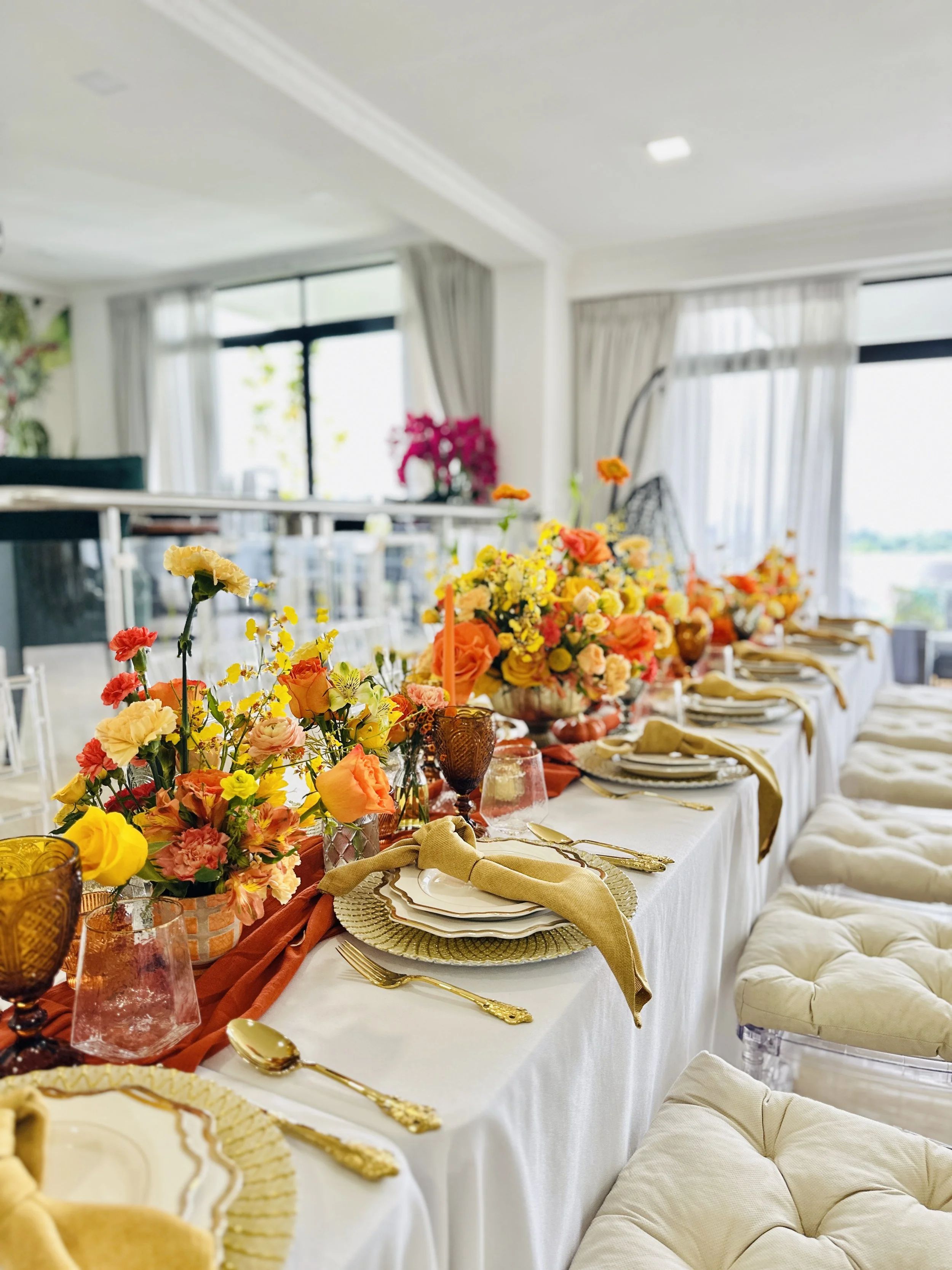 Designed to elevate any gathering, this tablescape features rich autumnal hues, lush floral arrangements, and thoughtfully curated tableware. Perfect for Thanksgiving, weddings, or intimate dinners, "Autumn Bliss" captures the essence of fall with a sophisticated twist. From golden accents to earthy tones, every detail creates an inviting atmosphere that brings people together in celebration.