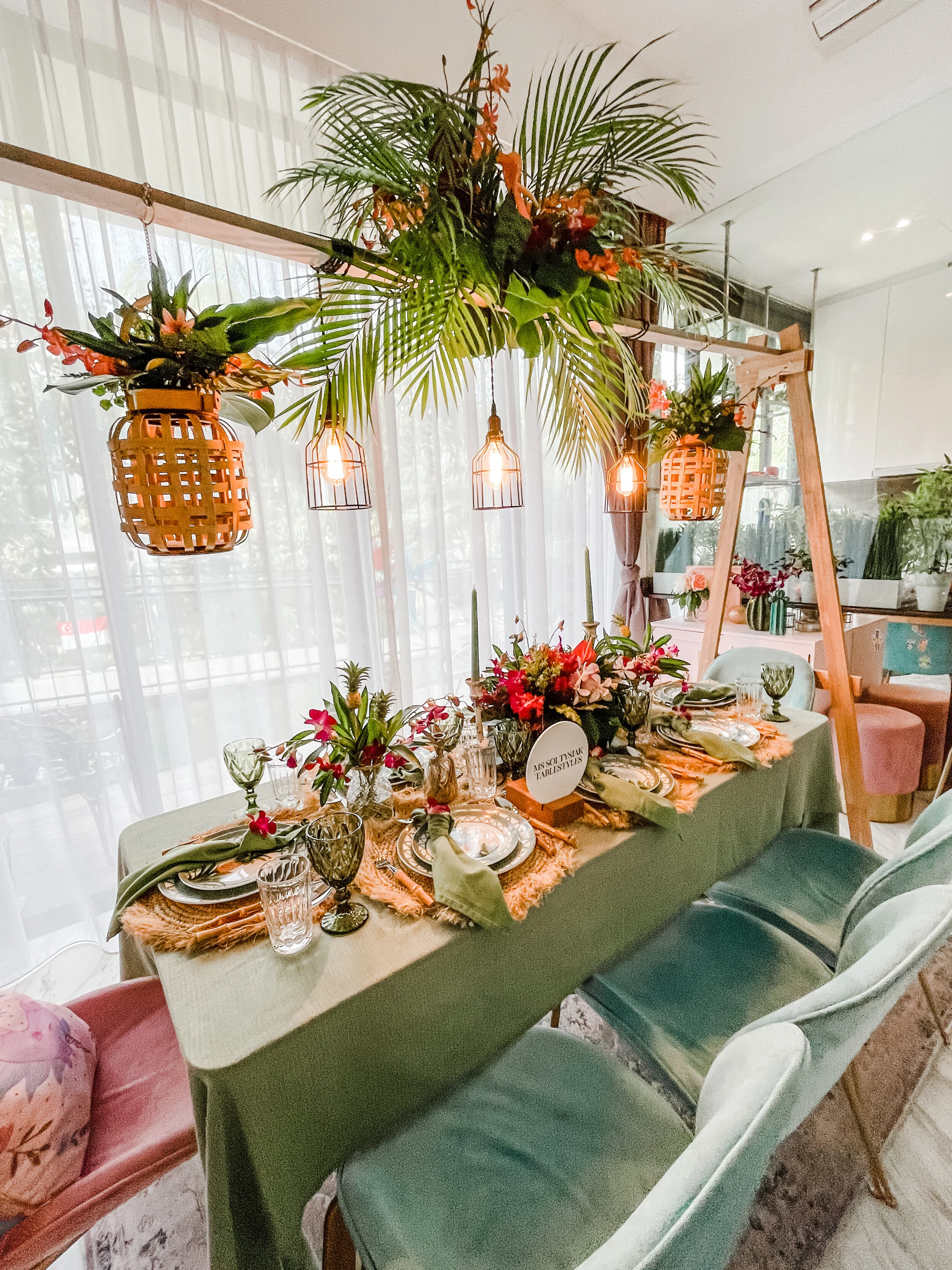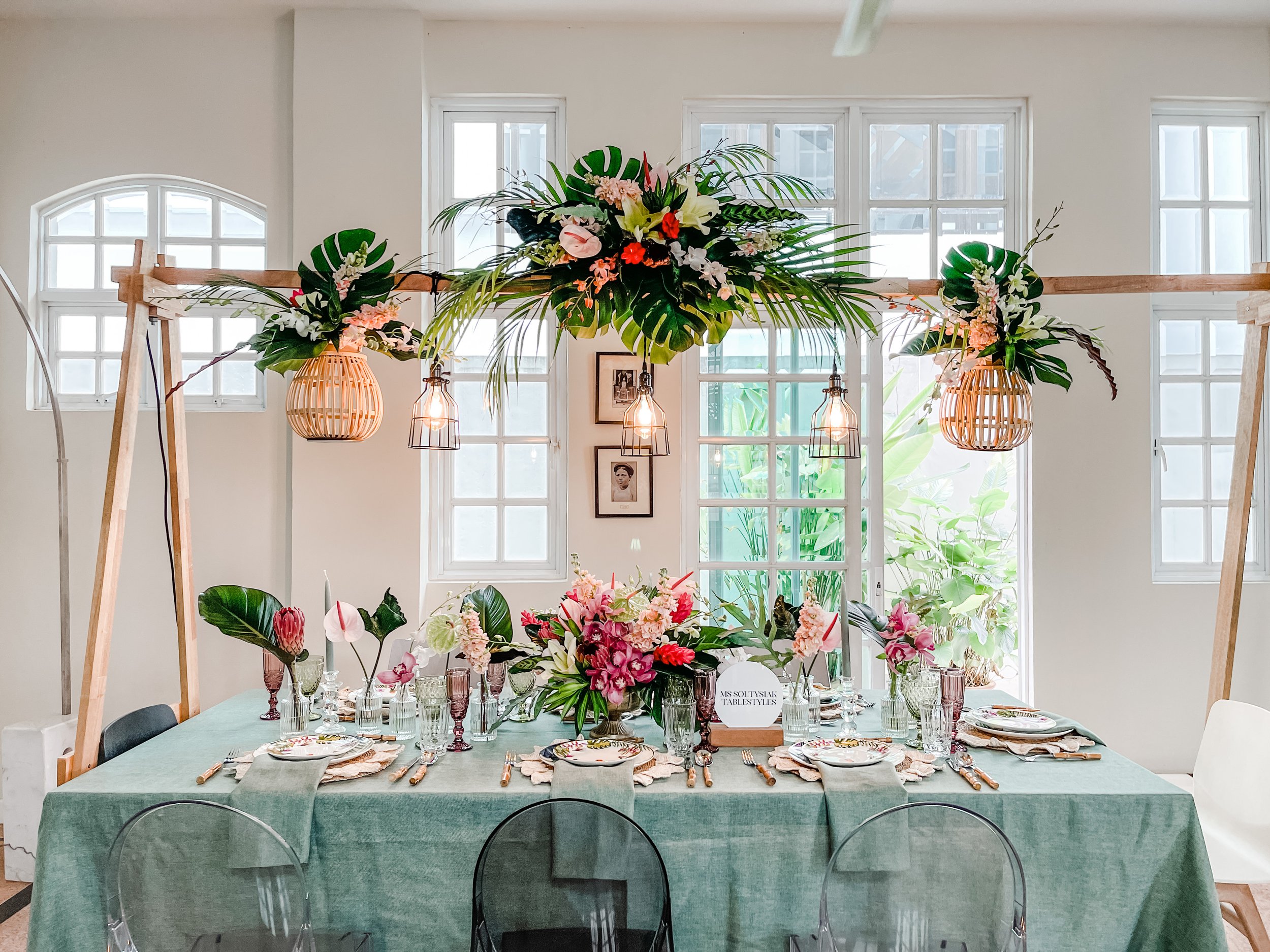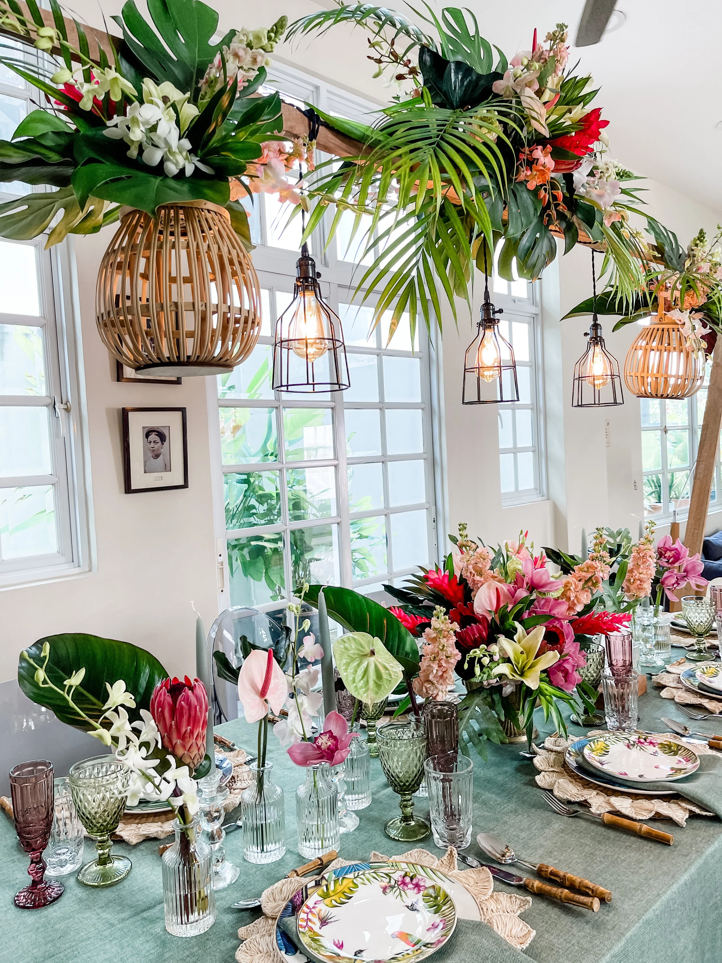 We feature our new and signature tablestyling wooden arch adorned with hanging vintage lights, rich palm and exotic leaves centrepiece, with decorated woven hanging bamboo lanterns, plenty of vibrant orchids, fun little pineapples - all beautifully matched with our tableware pieces.