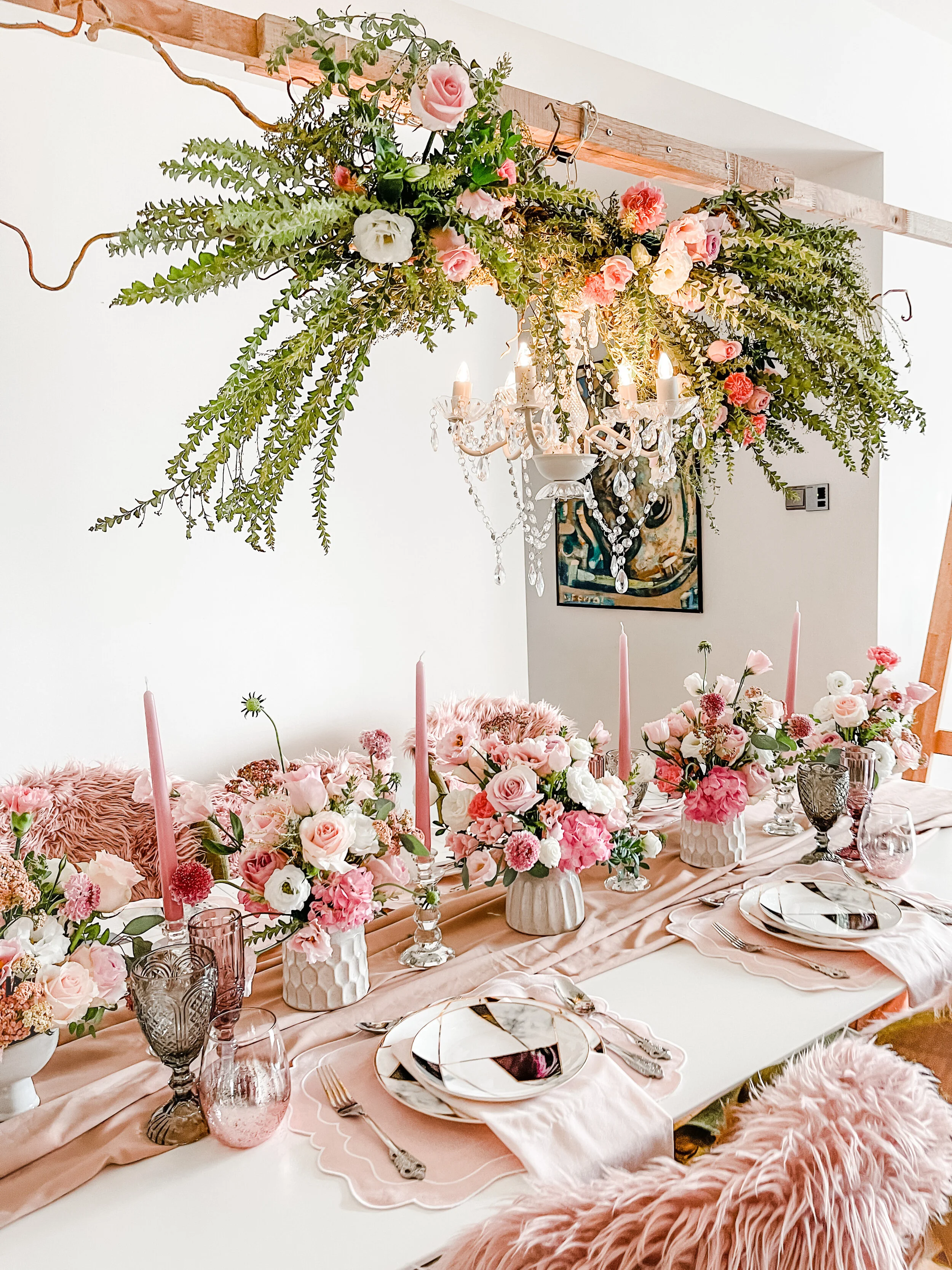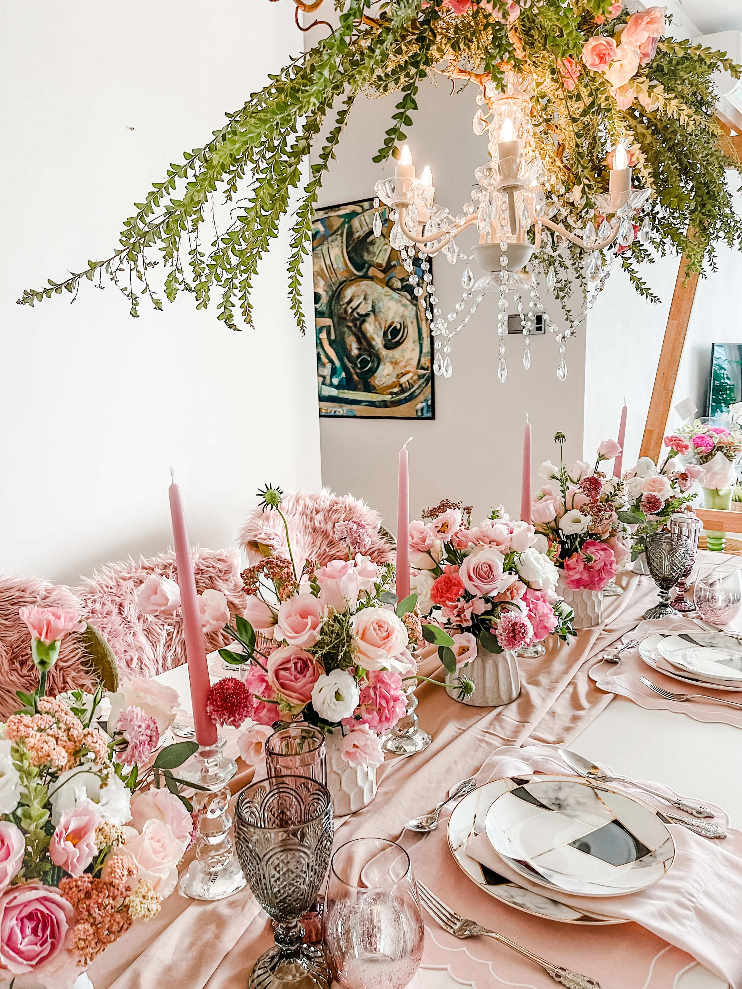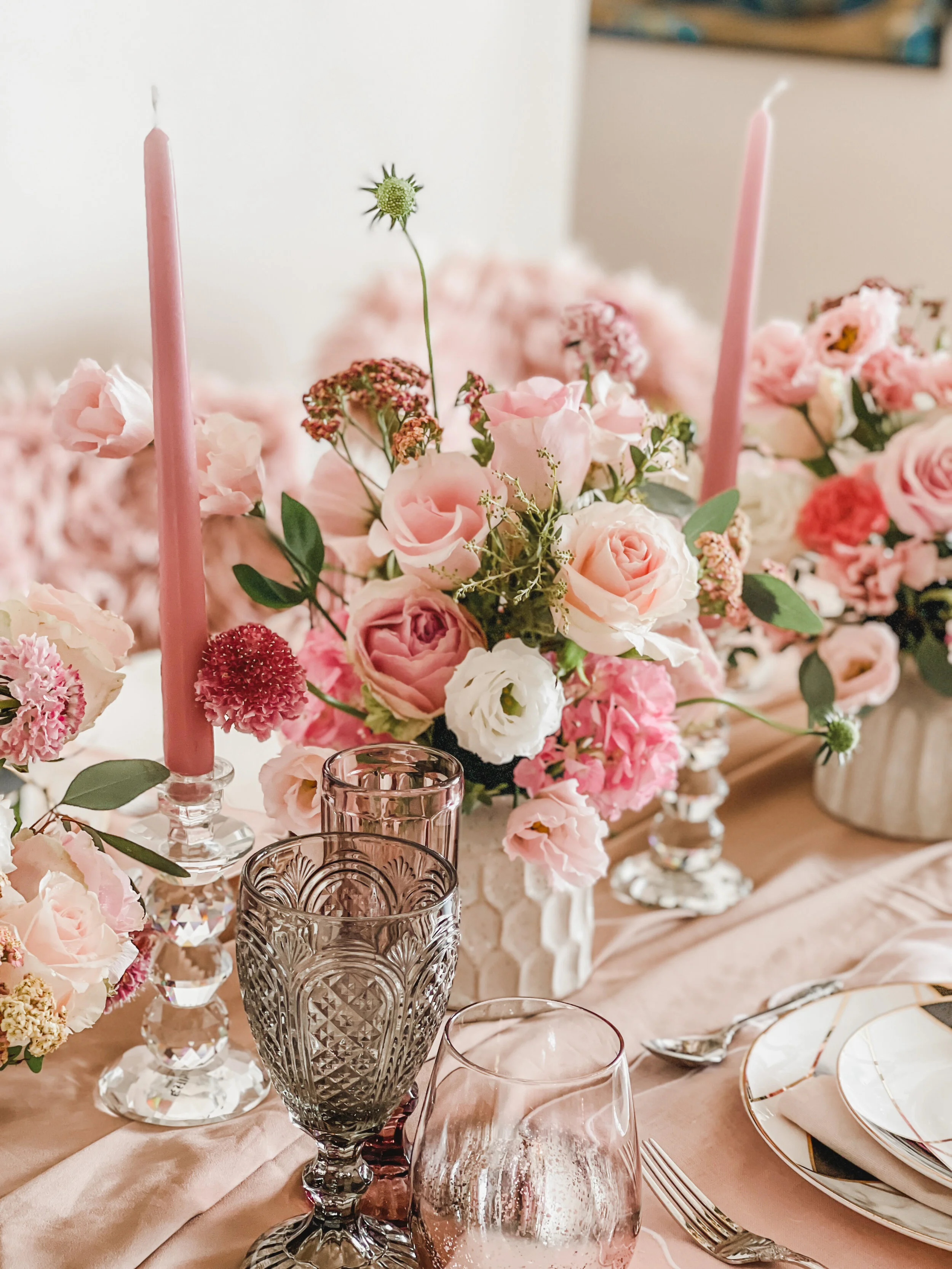 An elegant and sophisticated table setting perfect for special occasions and romantic events. With a focus on soft, romantic shades of pink, this table style is sure to create a warm and inviting atmosphere for your guests.