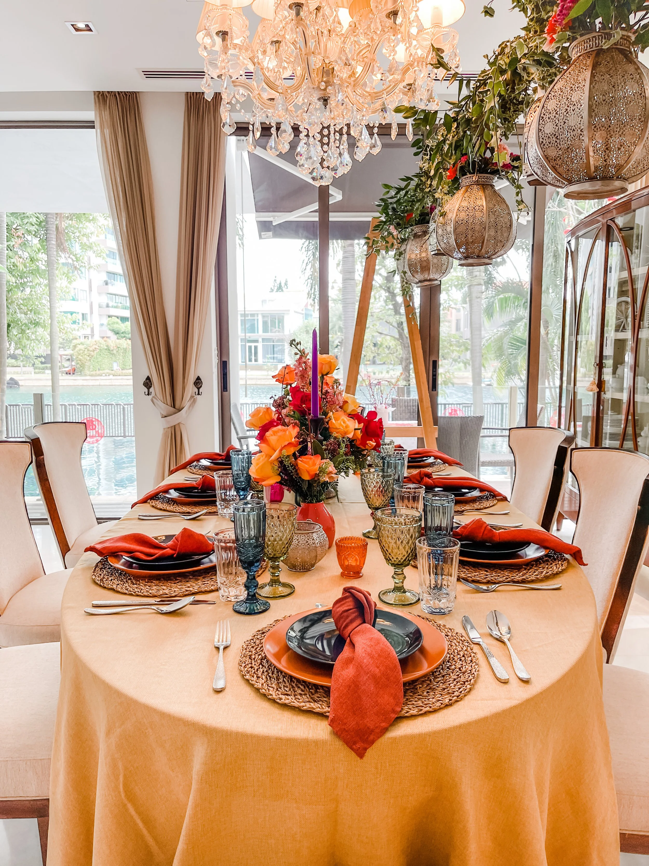 With a beautiful mix of Moroccan lamps and candles, this toasty set-up is bound to impress. Our bright floral bouquets and tableware are reminiscent of this beautiful country- it’s almost as if you’re dining there!